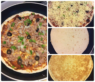 Levar uma tortilha numa frigideira a lume médio a alto. Deitar o molho de tomate e espalhar. Dispor o atum, as azeitonas e o pimento e no fim o queijo e tapar com outra tortilha. Aguardar que o queijo derreta e cole as tortilhas, verificando que a tortilha que está por baixo não queima. Virar com a ajuda de uma espátula e deixar a outra tortilha tostar um pouco.